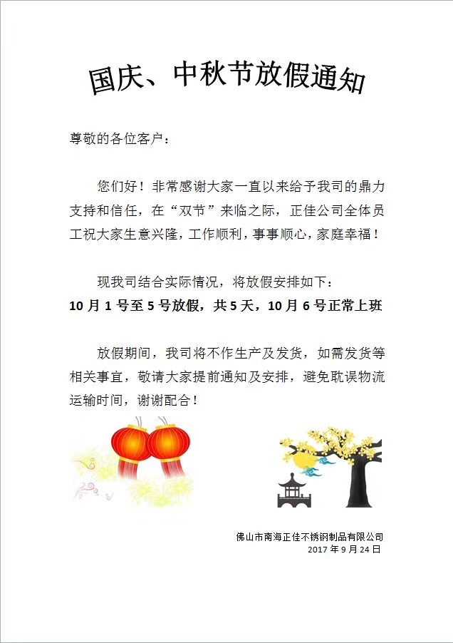 国庆中秋双节放假通知